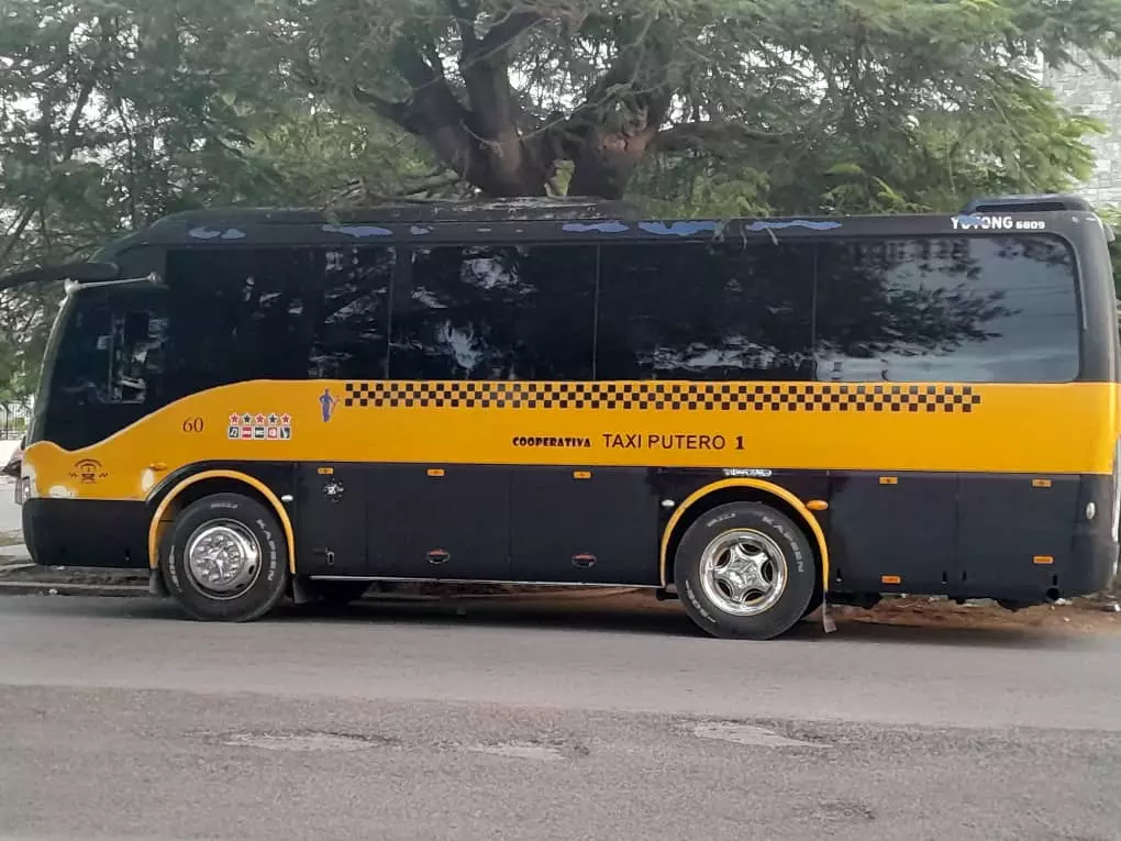 Y ahí está cada tarde en torno a las 5pm un ómnibus denominado taxi rutero, perteneciente a una cooperativa cuya misión es cubrir una determinada ruta en la ciudad dada las enormes dificultades que enfrenta la isla con el transporte público.