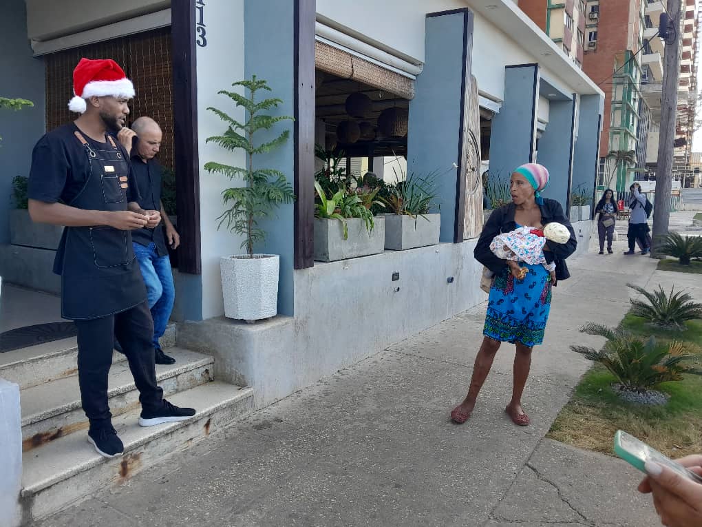 Flaca, esquelética, joven relativamente, mulata, con una dentadura que pide a gritos urgente atención estomatológica, esta mujer vive y muere paseándose con su criatura de brazos por la acera donde existen varios restaurantes bien concurridos en la zona del Malecón habanero.
