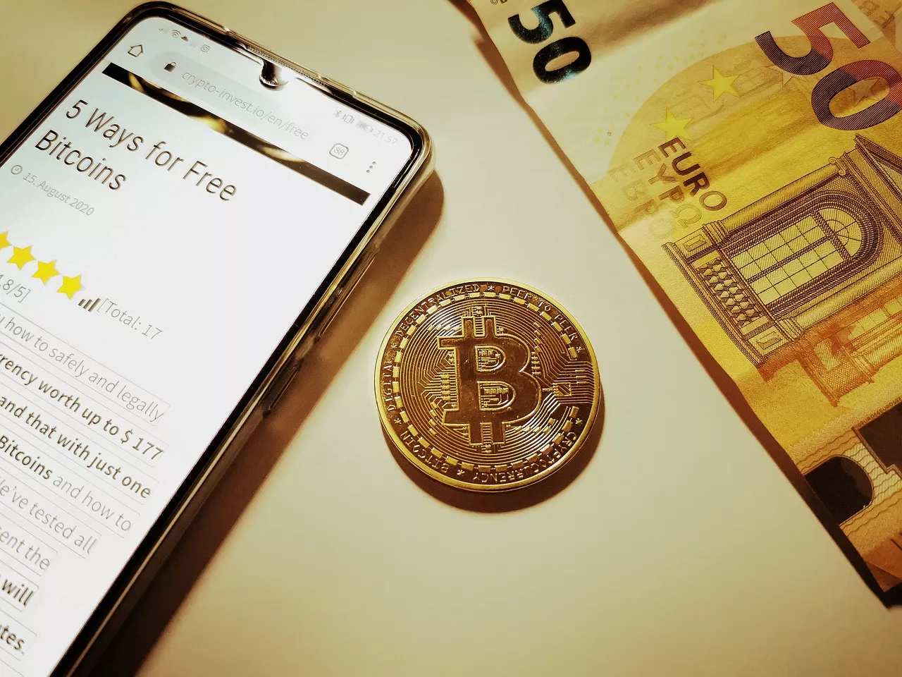 Imagen que muestra un Bitcoin junto a un billete de 50 euros y un smartphone.