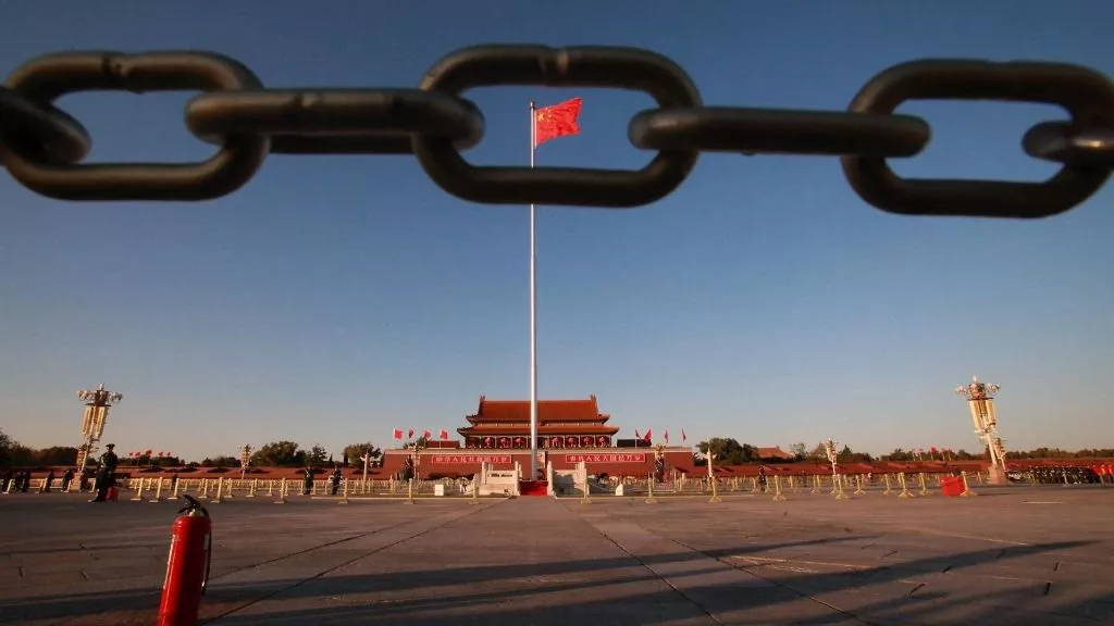 Bandera china ondeando en la plaza de Tiananmen de Pekín