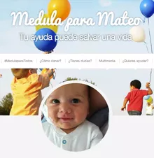 El bebé de 10 meses será intervenido el próximo abril después de que se haya encontrado un donante compatible de médula ósea. Las campañas en redes sociales consiguen su objetivo: que los ciudadanos actúen, se muevan por causas que ellos consideran importantes. Hace cosa de un año que los padres de Mateo comenzaron la búsqueda de un donante de médula ósea a través de twitter y mediante la web medulaparamateo.com Ahora el pequeño tiene 10 meses y la familia celebra que se haya encontrado un donante compatible. El trasplante se realizará el próximo mes de abril en el hospital madrileño de La Paz, con el fin de erradicar la leucemia que padece Mateo. El donante ha sido encontrado a través del Registro Español de Donantes de Médula Ósea.
