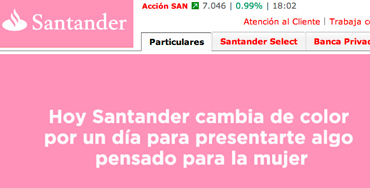Banco Santander lanza mañana una iniciativa que le llevará a cambiar por primera vez en la historia el rojo de su logotipo y su web comercial al color rosa. Banco Santander quiere mostrar su compromiso con la salud y la prevención de las enfermedades que afectan a la mujer. Como muestra de ello, Banco Santander lanza mañana una iniciativa que le llevará a cambiar por primera vez en la historia el rojo de su logotipo y su web comercial www.bancosantander.es al color rosa, el color identificativo de la lucha contra el cáncer.