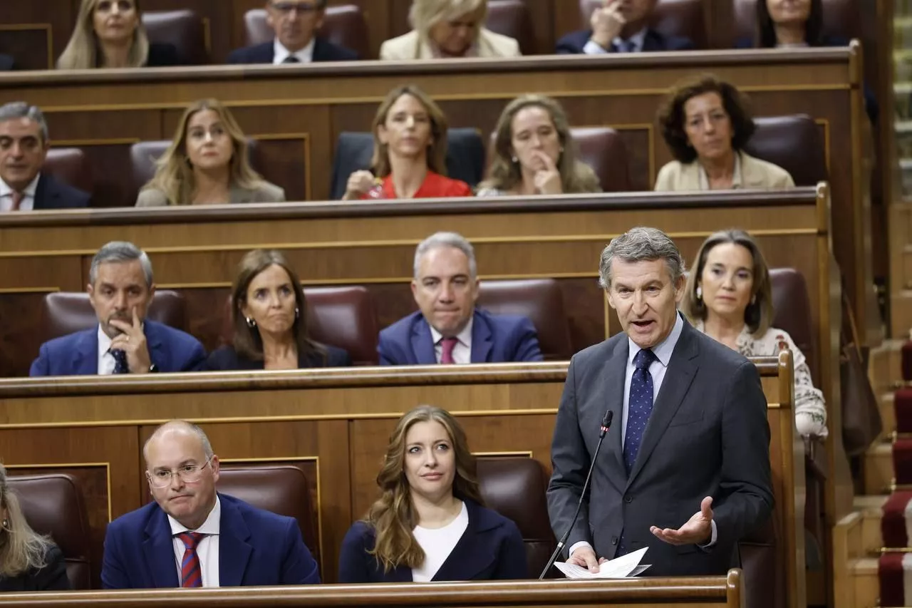 Feijóo acusa a Sánchez de aumentar impuestos en el parlamento español. La tensión política se siente en el ambiente.