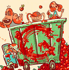 En una imagen animada podemos ver a un joven subido a un poste, intentando esquivar los ‘tomatazos’ que se están tirando un grupo de personas en la calle y desde un camión abarrotado de la hortaliza.