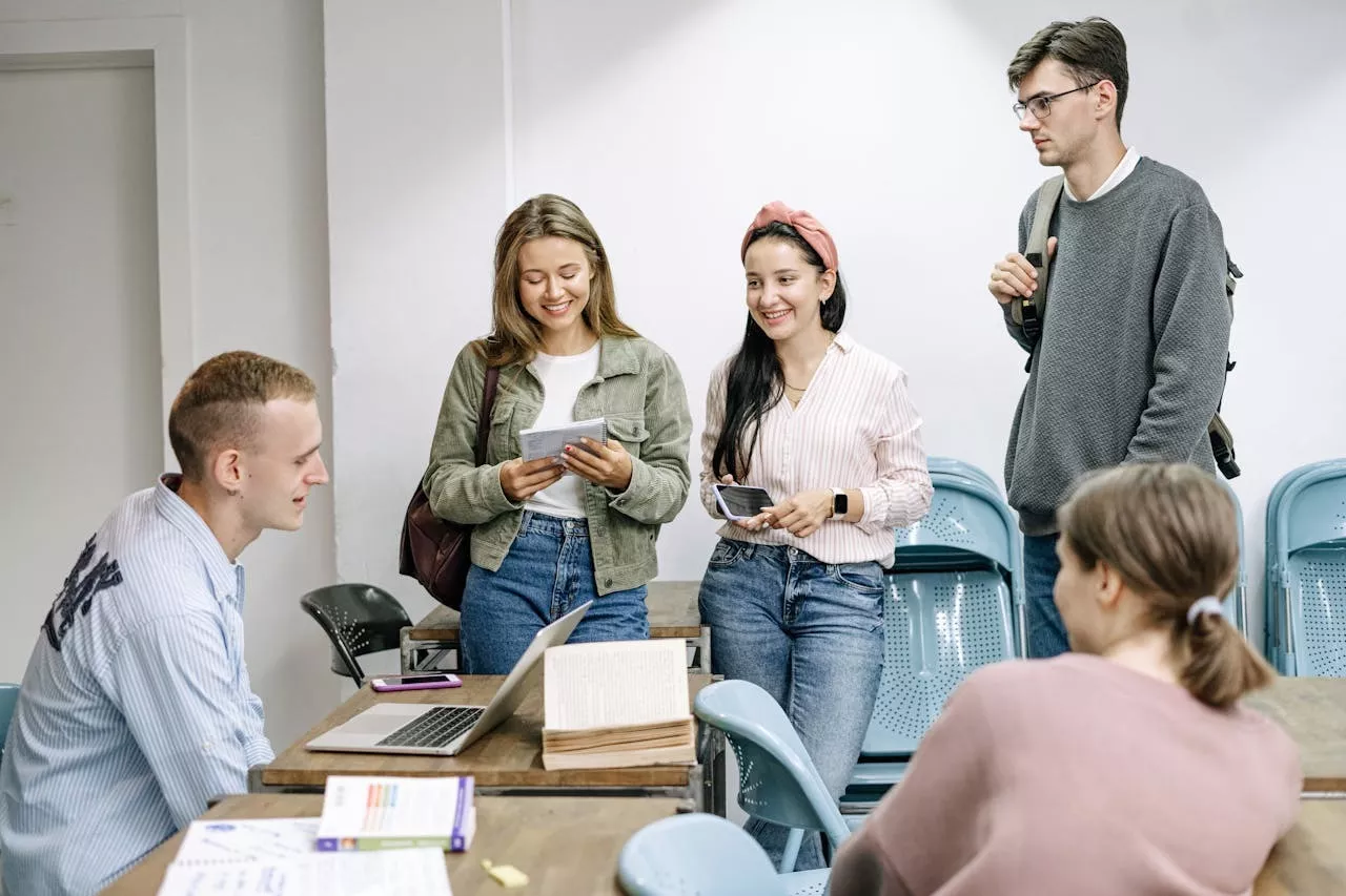 Un grupo de estudiantes se reúne para hablar sobre certificaciones de inglés como IELTS y Cambridge.