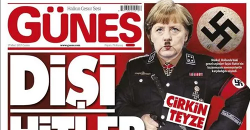 «No se diferencia en nada de Hitler», se lee en una página interior y bajo este titular aparece de nuevo la canciller alemana realizando el saludo nazi. El periódico turco cercano al Gobierno «Günes» describió a la canciller alemana, Angela Merkel, como un «Hitler femenino» y la caricaturizó con un uniforme de las SS y junto a una esvástica en su edición de hoy.