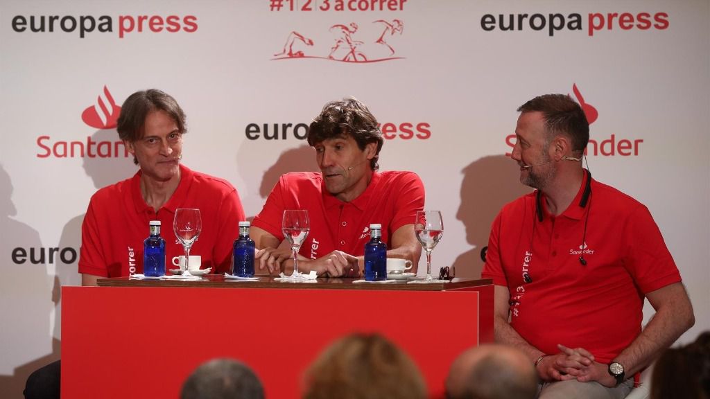 Julio Salinas participó este viernes junto a la exjugadora de balonmano Eli Pinedo, el exjugador de voleibol Rafa Pascual y el exwaterpolista Pedro García Aguado en la presentación del reto ‘Mi Primer Maratón’ del Banco Santander, que llevará a los cuatro a correr este domingo el Maratón de Sevilla.