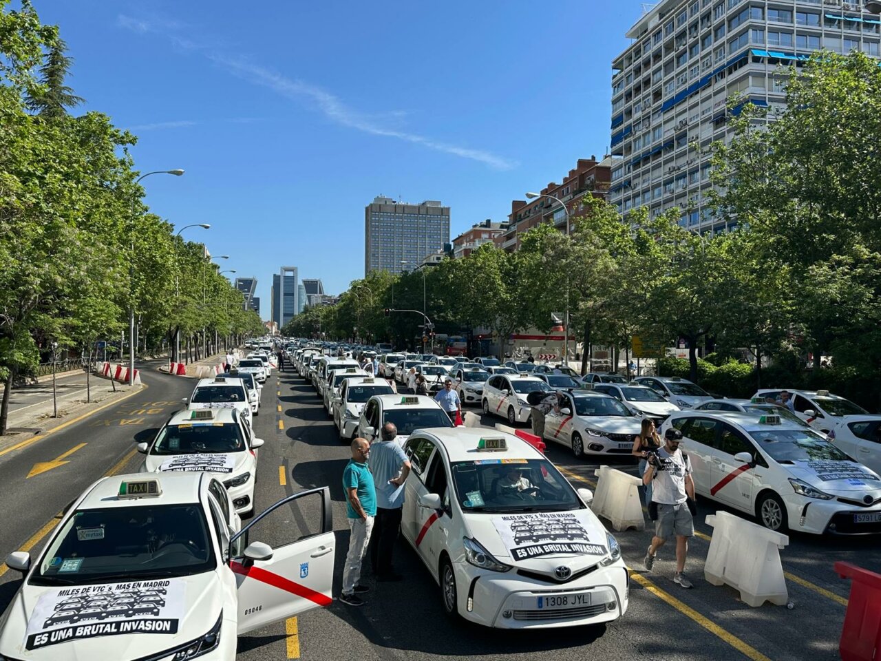 Los taxistas han ocupado todos los carriles de la margen derecha del Paseo de la Castellana, marchando lentamente y haciendo sonar sus bocinas, tras una gran pancarta en la que se podría leer ‘Es una invasión, no cabe ni una más’, recoge la citada agencia.