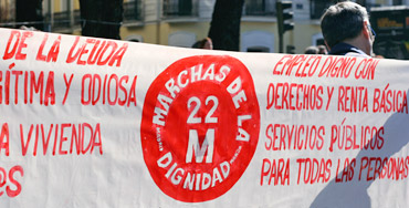 Bajo el lema ‘Pan, trabajo y techo. Son nuestros derechos’, las ‘Marchas de la Dignidad’ se han manifestado por toda España en una “jornada de lucha contra los recortes” con la que quieren destacar que su ‘lucha’ no terminó el mencionado 22 de marzo, sino que continúa para, entre otras cosas, rechazar el pago de la deuda, a la que tachan de “ilegal, ilegítima y odiosa”.