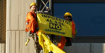 Por ello un grupo de cuatro activistas han escalado hasta la parte más alta de la torre, ubicada junto al ministerio de Industria (perteneciente al Ministerio de Hacienda). “Recordamos que, de ser aprobado, esta legislación obligará a los consumidores que produzcan su propia energía y estén conectados a la red a pagar un ‘impuesto al sol’ por la energía que han producido para consumo propio”, denuncia Greenpeace.