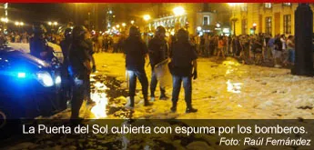 Los bomberos de Madrid han cubierto de espuma el suelo de la Puerta del Sol en un gesto simbólico para protestar contra los recortes del Gobierno. En Barcelona también han hecho un gesto similar.