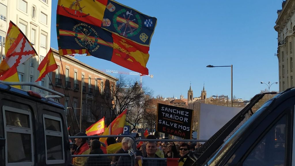‘Por el futuro de España Unida’. Este es el lema de la manifestación que la mañana de este sábado ha recorrido las calles del centro de Madrid contra el acuerdo entre PSOE y ERC para facilitar la investidura de Pedro Sánchez. Precisamente, esta marcha ha terminado en las inmediaciones del Congreso, que acoge desde primera hora el debate de investidura.