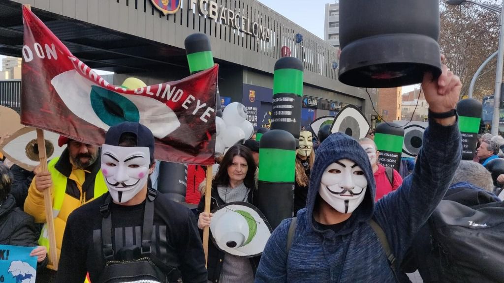 Manifestantes convocados por Tsunami Democràtic protestan desde las 16 horas de este miércoles en los aledaños del Camp Nou en Barcelona para exigir diálogo al Estado -bajo el lema #SpainSitAndTalk-, «derechos, libertad y autodeterminación», con motivo del partido de Liga que enfrentará a las 20 horas al FC Barcelona y al Real Madrid.